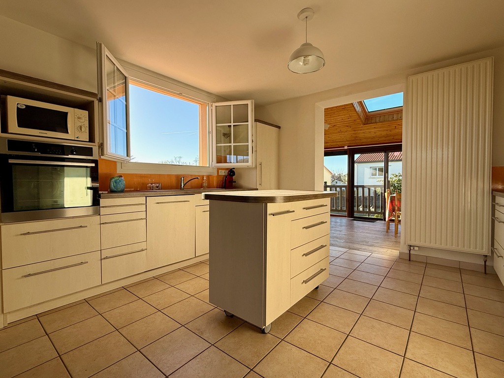 Salon-séjour de 32 m2 avec cheminée, cuisine aménagée et équipée de 18 m2.